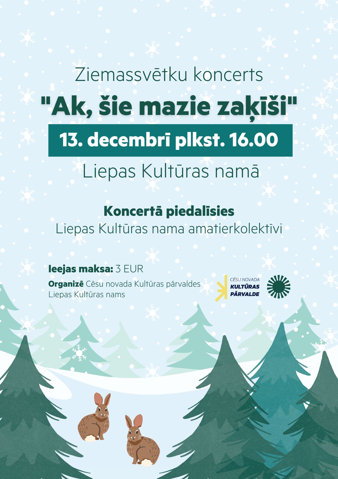 Sestdien, 13. decembrī, plkst. 16.00 Liepas Kultūras namā notiks amatierkolektīvu Ziemassvētku koncerts “Ak, šie mazie zaķīši”.