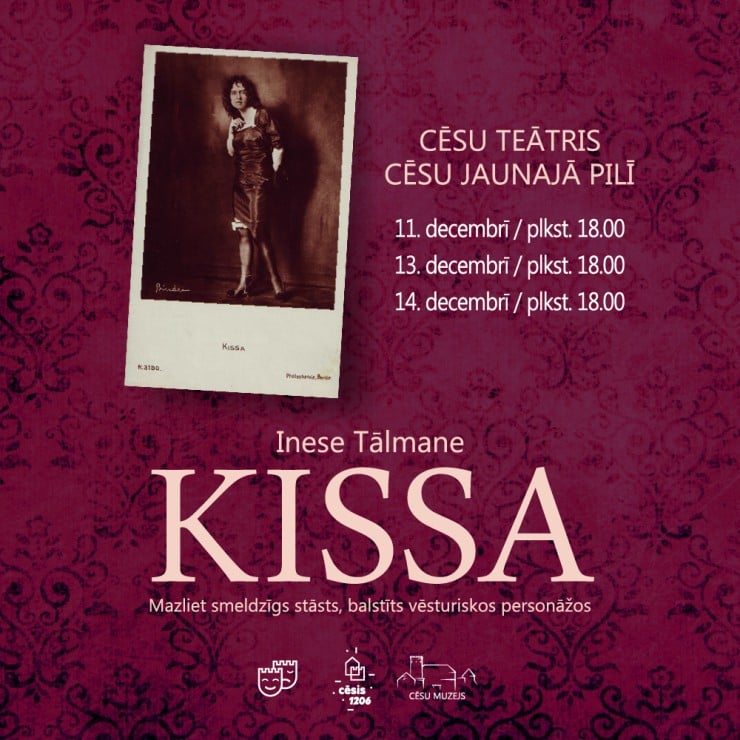 CĒSU TEĀTRA iestudējums I. Tālmane KISSA, balstīts uz vēsturiskiem personāžiem un notikumiem 1919.gadā, stāsta par leģendām apvīto vācbaltiešu, grāfu Zīversu dzimtas atvasi Katrīnu fon Zīversu, kura uzaugusi Cēsu Jaunajā pilī un vēlāk kļuvusi par mēmā kino aktrisi Vācijā. Ar skatuves vārdu Kissa viņa filmējusies Riharda Osvalda un Džo Meja filmās; kopumā kino vēsture min viņas dalību vismaz deviņpadsmit mēmā kino filmās, arī kopā ar latviešu aktrisi Mariju Leiko. Dramaturģe Inese Tālmane, kura aizvien pamanāk sevi piesaka kā viena no jaunajām, talantīgajām latviešu dramaturģēm, radījusi smeldzīgu stāstu par muižnieku dzimtas pārstāvi, kas uzdrīkstējusies sekot savam sapnim un pārkāpt pāri sava laikmeta aizspriedumiem.
