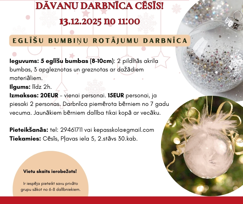 Sestdien, 13. decembrī, plkst. 11.00 “Ķepas skola” telpās Pļavas ielā 5, 2. stāvā, 30.kabinetā notiks EGLĪŠU BUMBIŅU ROTĀJUMU DARBNĪCA.
