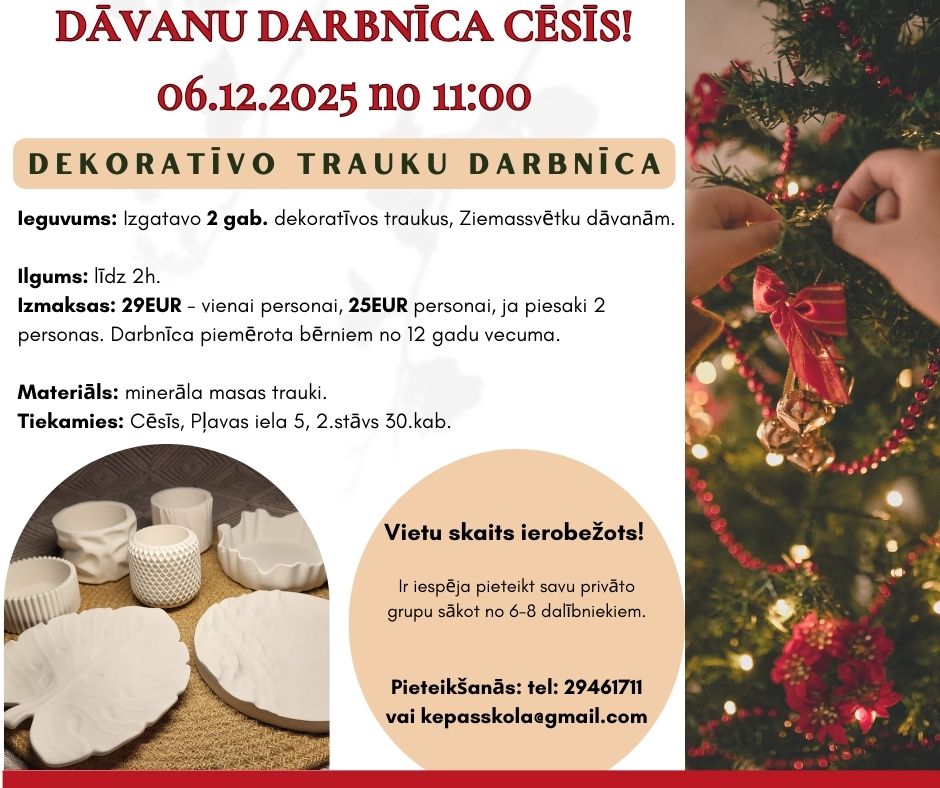 Sestdien, 6. decembrī, plkst. 11.00 “Ķepas skola” telpās Pļavas ielā 5, 2. stāvā, 30.kabinetā notiks DEKORATĪVO TRAUKU DARBNĪCA.