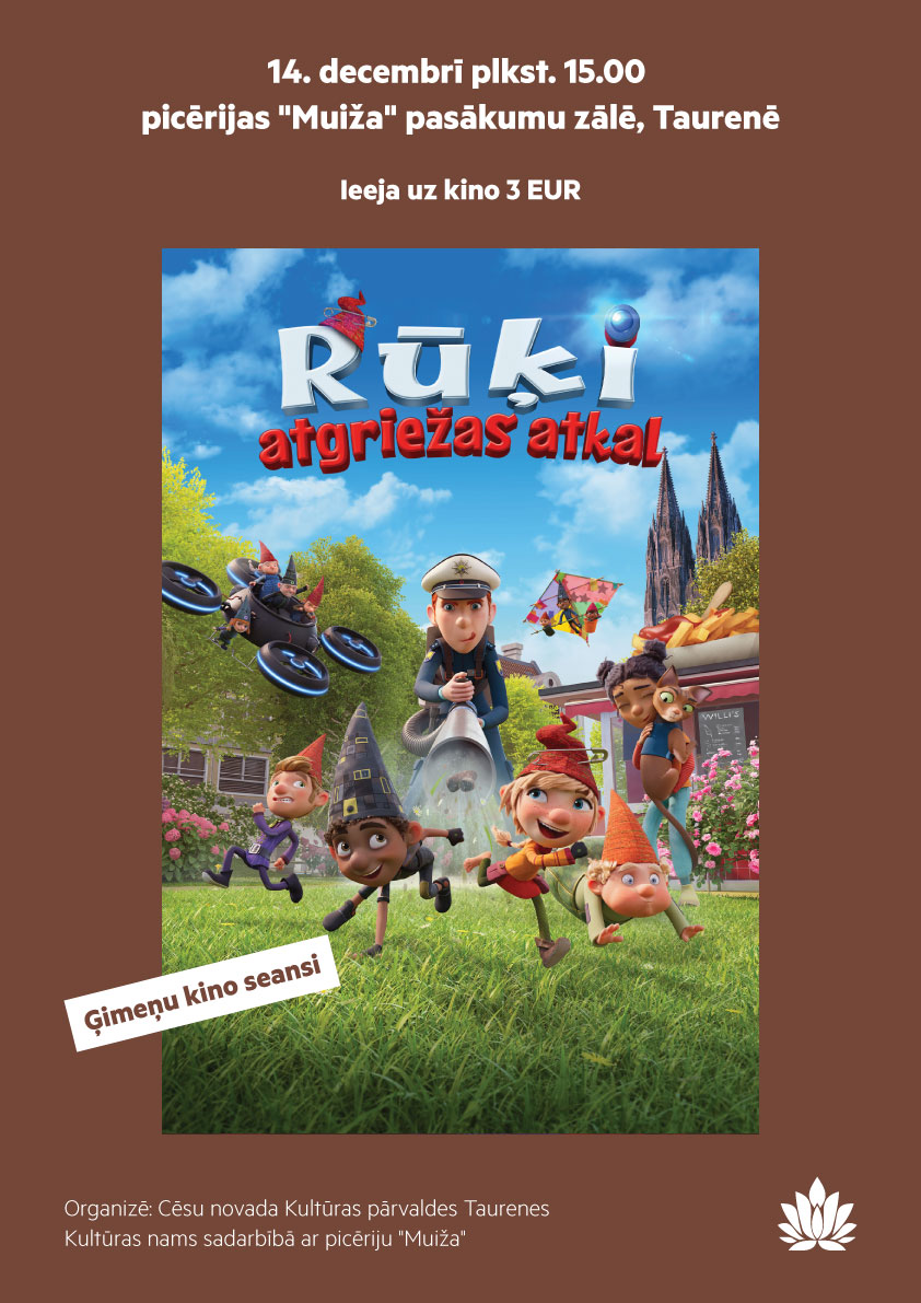 Svētdien, 14. decembrī, plkst. 15.00 picērijas “Muiža” pasākumu zālē, Taurenē, notiks filmu pēcpusdiena ģimenēm ar bērniem, kurā būs skatāma animācijas filma “Rūķi atgriežas atkal”.