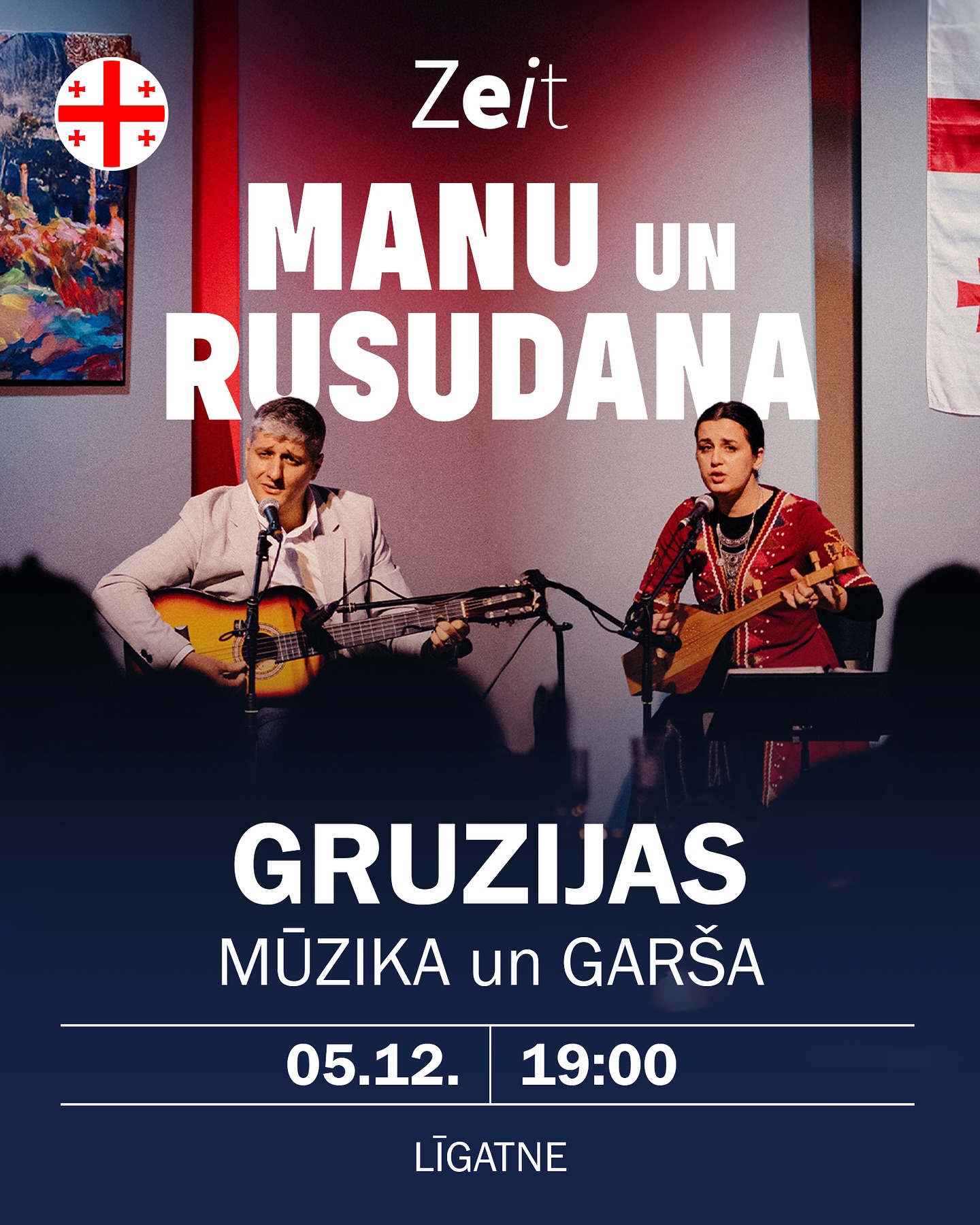 Piektdien, 5. decembrī. plkst. 19.00 aicinām izbaudīt Gruzijas mūzikas un garšu vakaru radošā kvartāla “Zeit” lielajā zālē. Par sirsnīgu un piepildītu muzikālo vakaru parūpēsies Rusudana un Manu. Šefpavārs Oskars piedāvās nobaudīt autentiskus gruzīnu virtuves ēdienus.