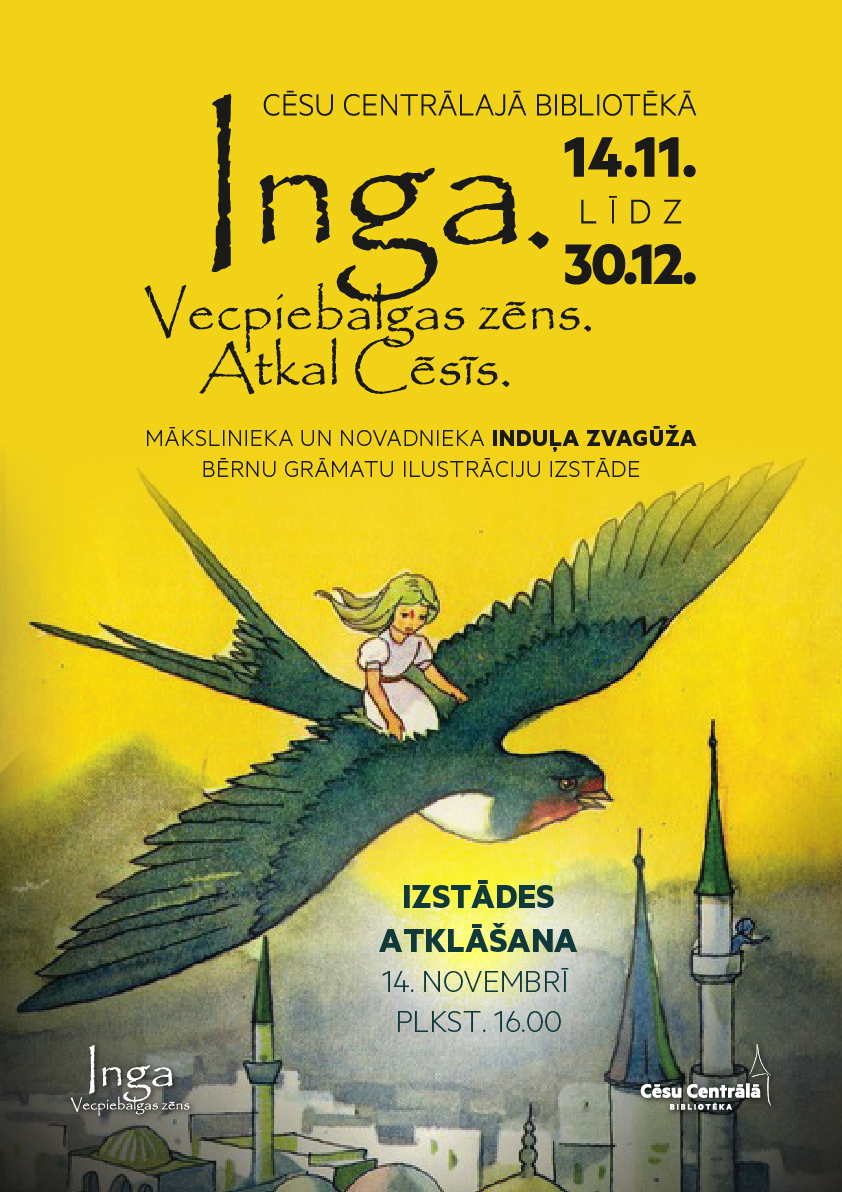 No 14. novembra līdz 30. decembrim Cēsu Centrālajā bibliotēkā skatāma mākslinieka un novadnieka Induļa Zvagūža bērnu grāmatu ilustrāciju izstāde “Inga. Vecpiebalgas zēns. Atkal Cēsīs”.