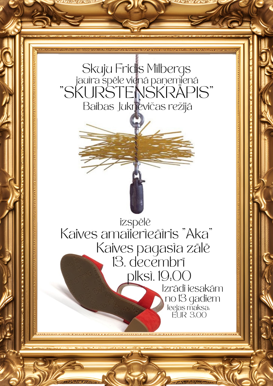 Sestdien, 13. decembrī, plkst. 19.00 Kaives pagasta zālē notiks Kaives amatierteātra “Aka” izrāde “Skursteņskrāpis” (autors Skuju Frīdis Mīlbergs, režisore Baiba Jukņeviča).