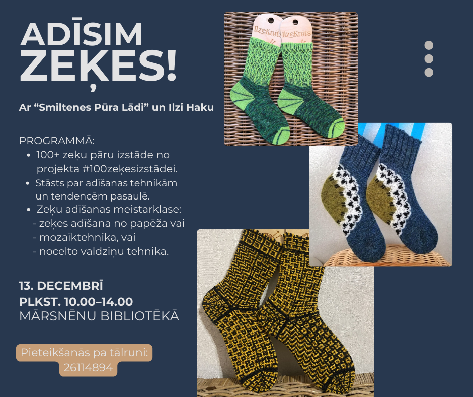 Šoreiz aicinām pievienoties zeķu adīšanas meistarklasei, kur adītājām/-iem, kam zeķu stiķēšana nav sveša lieta, būs iespēja apgūt kādu neierastāku tehniku – zeķes adīšanu no papēža, mozaīktehniku vai nocelto valdziņu tehniku.
