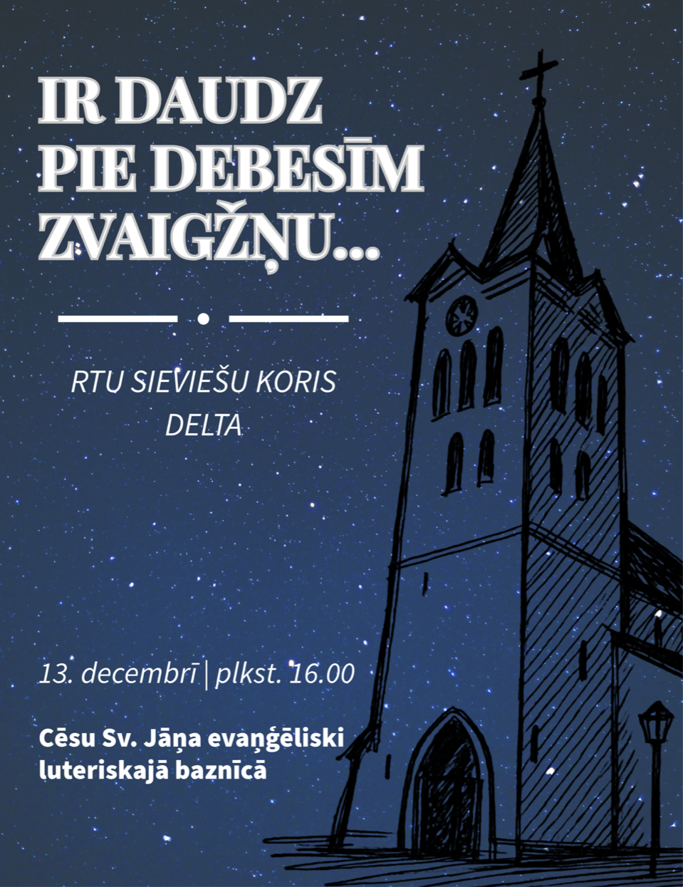 Sestdien, 13. decembrī, plkst. 16.00 Cēsu Sv. Jāņa evaņģēliski luteriskajā baznīcā uz skaistu svētku noskaņas koncertu “Ir daudz pie debesīm zvaigžņu…” aicina RTU sieviešu koris “Delta”.
