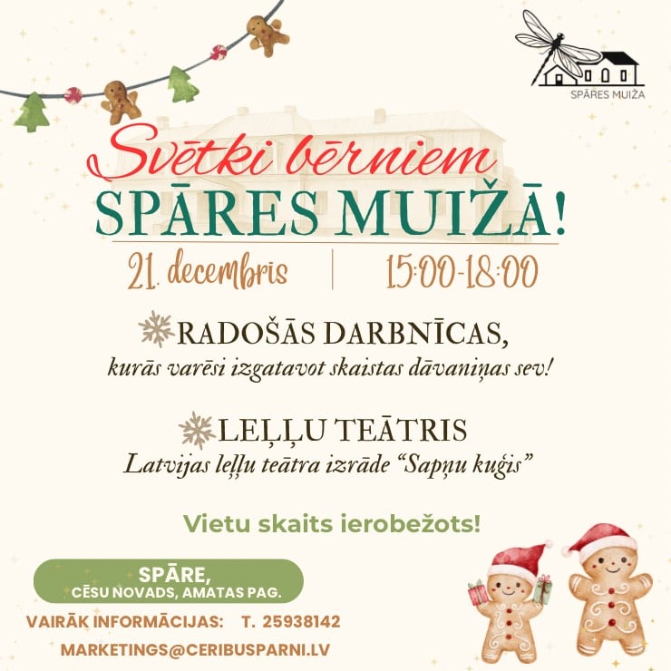 Tāpēc aicinām ģimenes uz sirsnīgu pirms Ziemassvētku pasākumu, kas notiks 21. decembrī Spārē, muižas svētku zālē — vietā, kur šajā laikā valdīs īpaša Ziemassvētku noskaņa.