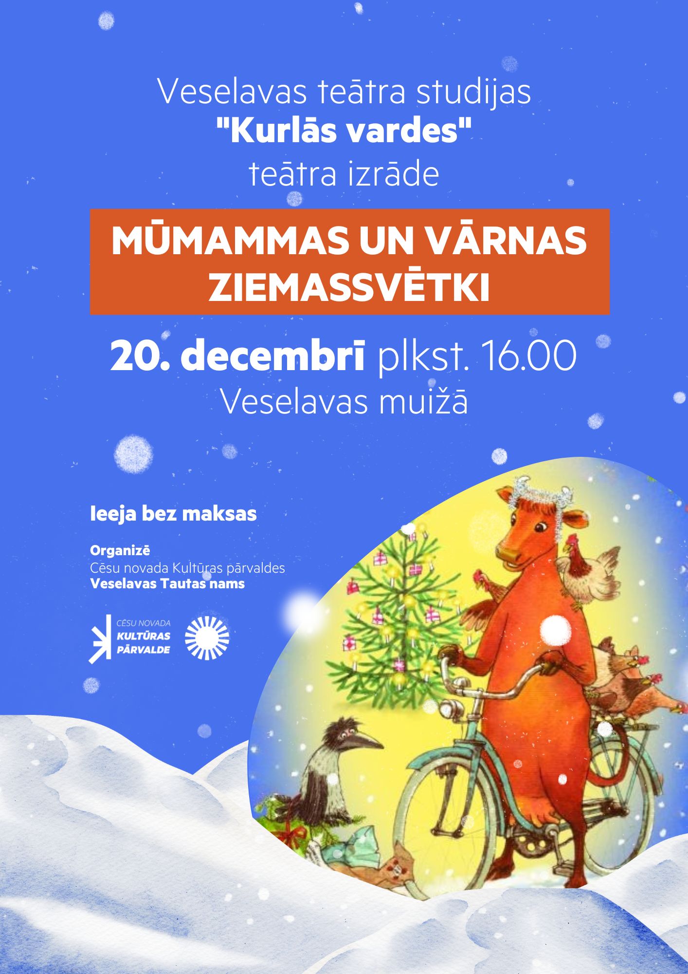 Sestdien, 20. decembrī, plkst. 16.00 Veselavas muižā būs skatāma Veselavas teātra studijas “Kurlās vardes” izrāde “Mūmammas un vārnas Ziemassvētki” – brīnišķīgs stāsts ģimenēm, ko radījuši Juja Vīslandere un Svens Nūrdkvists.