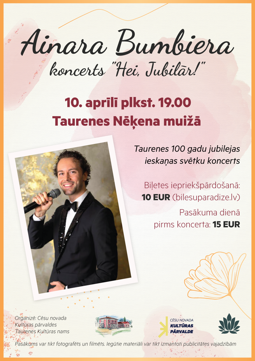 Kur skan smiekli, tur skan dziesma! Latvijā ir neoficiāls likums – ja mājās, pilsētā vai novadā svin kārtīgus svētkus, tad tur noteikti ir lieliskais Ainars Bumbieris. Viņa balss un enerģija ir kļuvusi par sinonīmu dzīvespriekam, un nav iedomājama neviena jubileja bez hita “Hej, jubilār!”, kas šobrīd ir populārākā apsveikuma dziesma republikā. 10. aprīlī plkst. 19.00 šī svētku enerģija piestās Taurenē, lai kopīgi ieskandinātu, ko patiešām īpašu.
