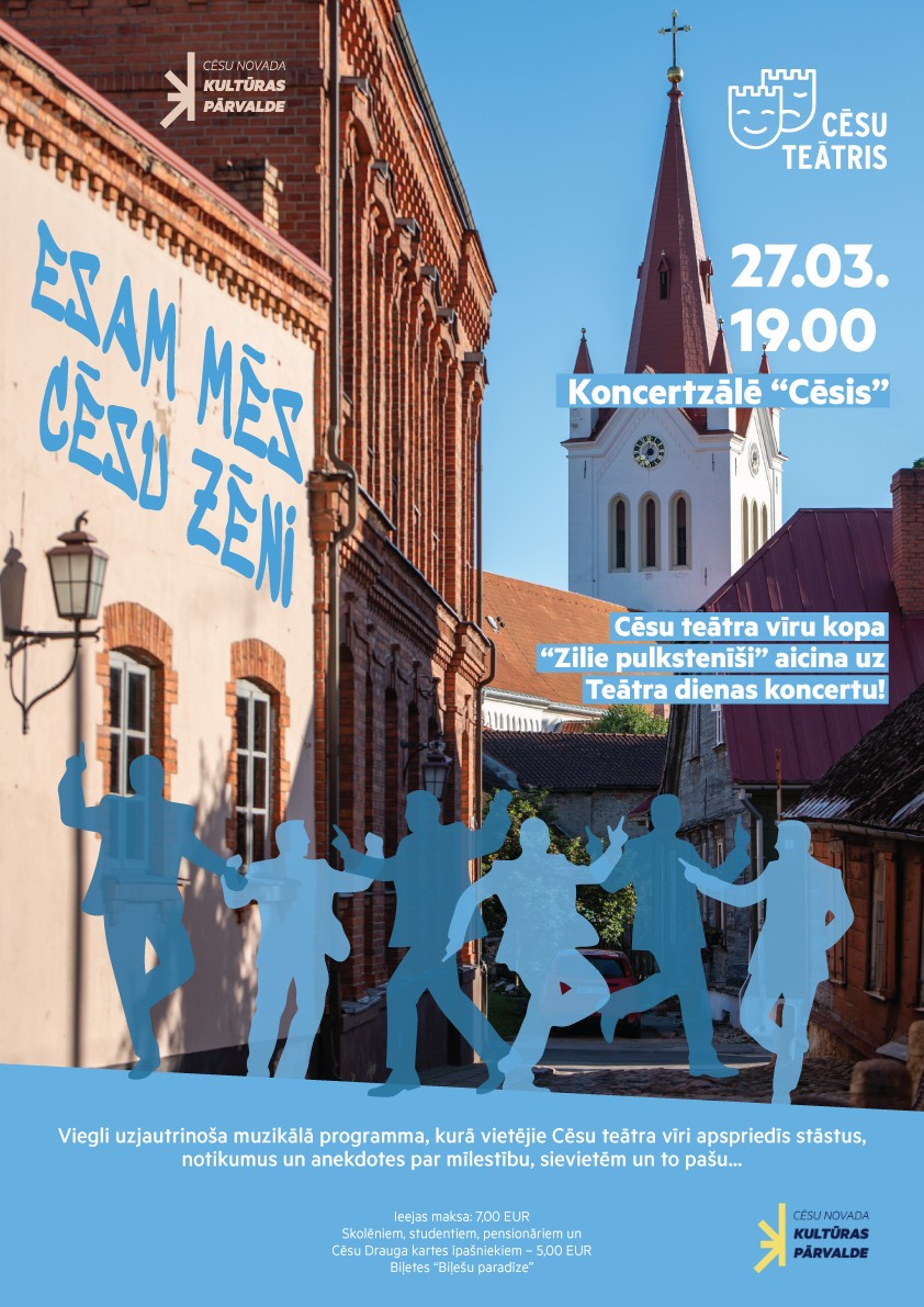 Cēsu Teātra vīru kopa “Zilie pulkstenīši” aicina uz Teātra dienas koncertu “ESAM MĒS CĒSU ZĒNI”, kas norisināsies 27. martā plkst. 19.00 koncertzālē “Cēsis”.
