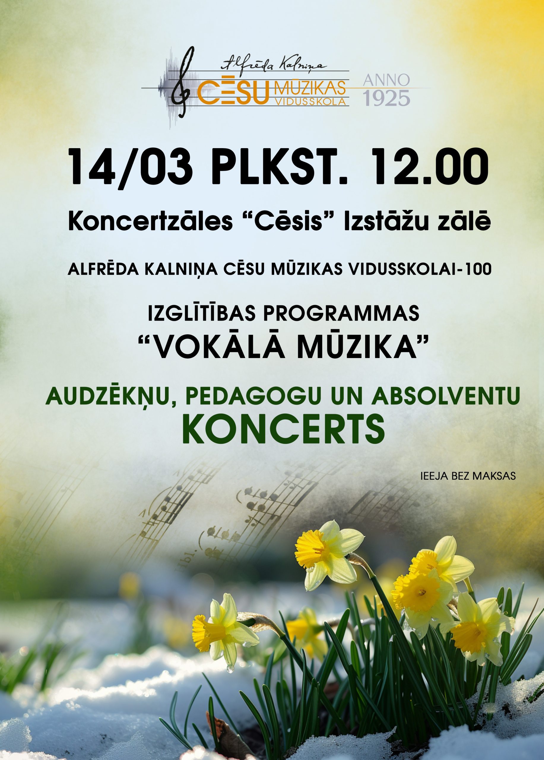 14. martā plkst. 12.00 Koncertzāles “Cēsis” Izstāžu zālē notiks Alfrēda Kalniņa Cēsu Mūzikas vidusskolas izglītības programmas “Vokālā mūzika” audzēkņu, pedagogu un absolventu koncerts.