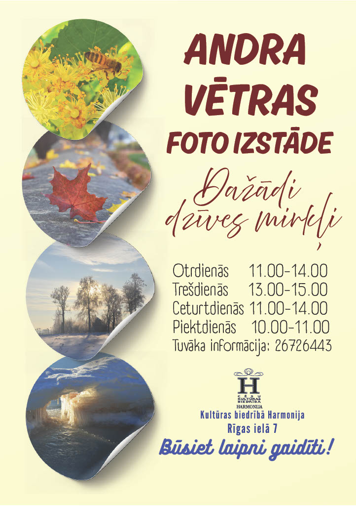Līdz 24. aprīlim kultūras biedrībā “Harmonija” apskatāma Andra Vētras foto izstāde “Dažādi dzīves mirkļi”.