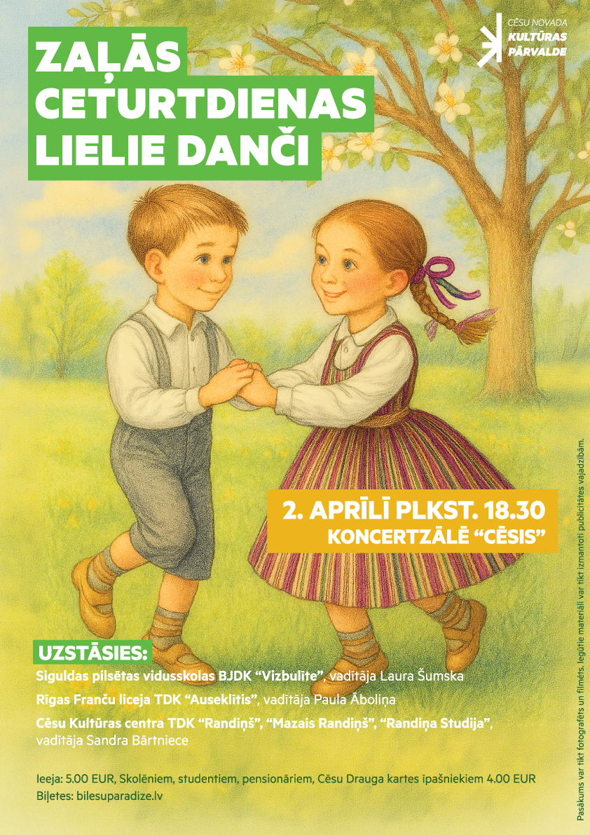 Bērnu tautas deju kolektīvs “Randiņš” 2. aprīlī plkst. 18.30 koncertzālē “Cēsis” aicina uz pavasarīgu deju koncertu “ZAĻĀS CETURTDIENAS LIELIE DANČI”, lai ar prieku par pavasari un dejām ieskandinātu Lieldienas!
