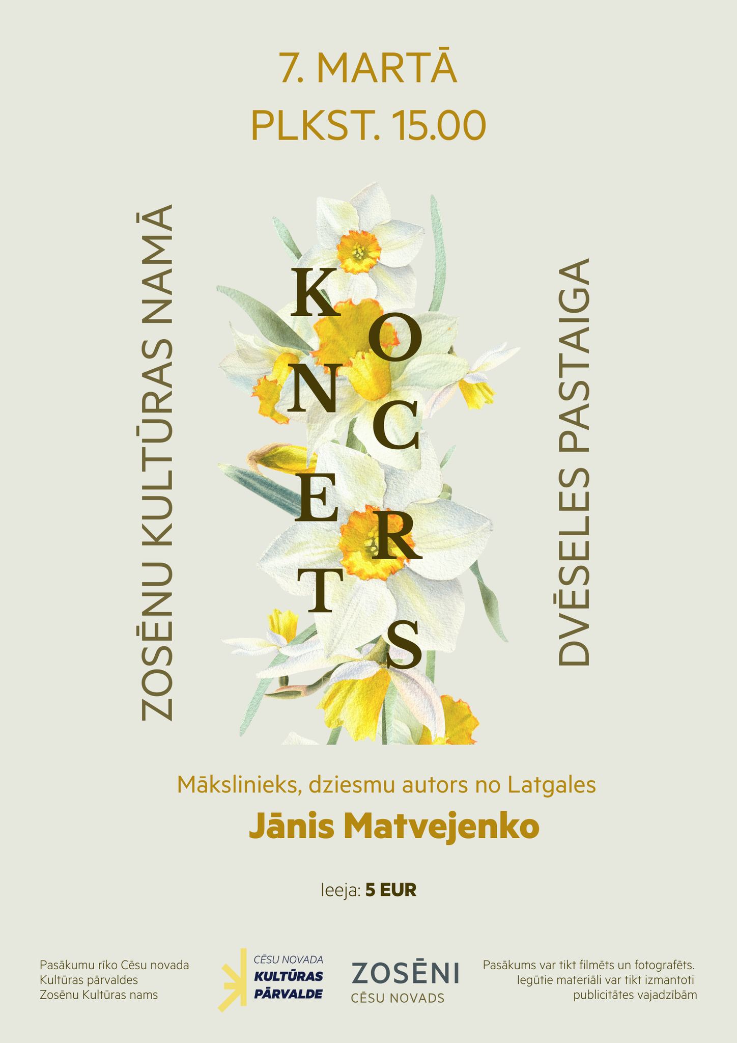 Sestdien, 7. martā, plkst. 15.00 Zosēnu Kuktūras namā izskanēs mākslinieka un dziesmu autora Jāņa Matvejenko koncerts “Dvēseles pastaiga”.