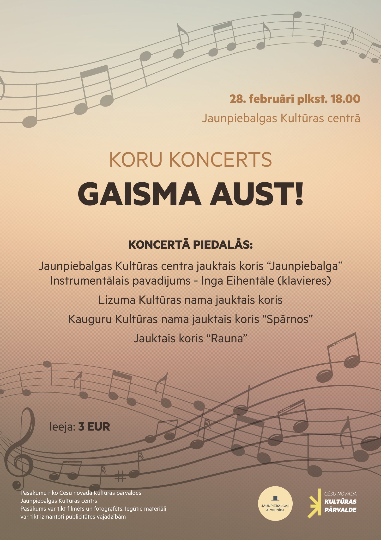 Sestdien, 28. februārī, plkst. 18.00 Jaunpiebalgas Kultūras centrā izskanēs koru koncerts “Gaisma aust!”.