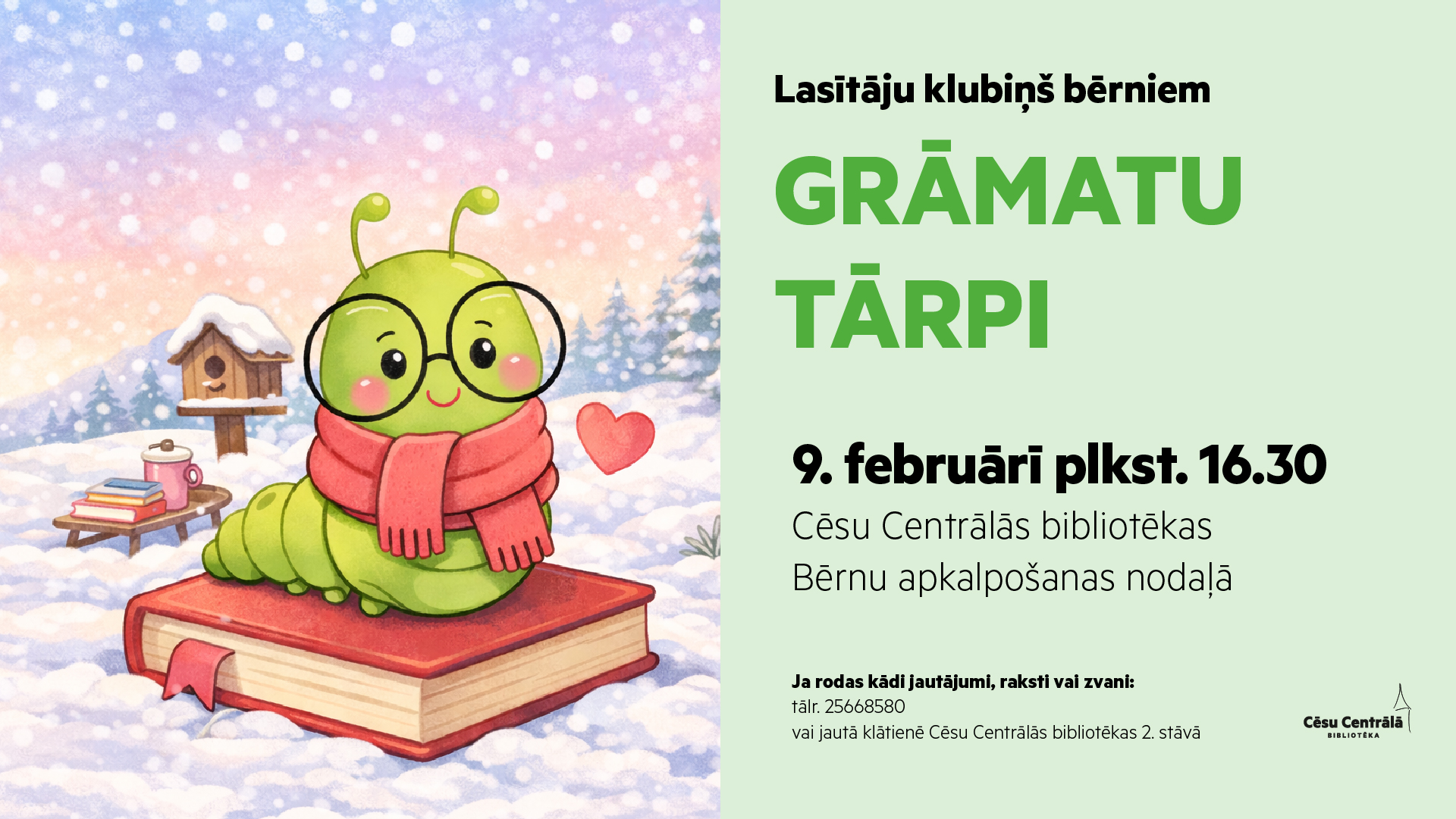 Pirmdien, 9. februārī, plkst. 16.30 aicinām bērnus uz lasītāju klubiņa “Grāmatu tārpi” tikšanos Cēsu Centrālās bibliotēkas Bērnu apkalpošanas nodaļā.