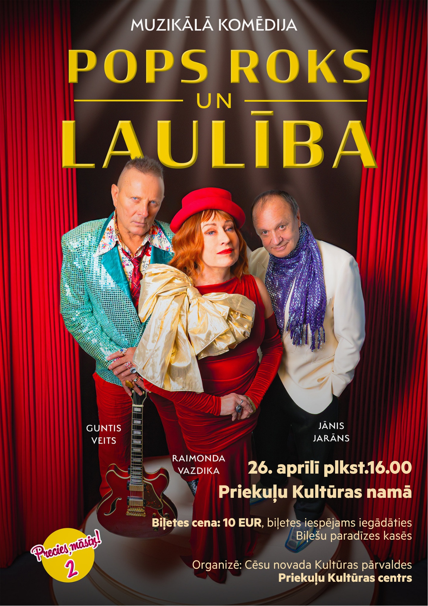 Svētdien, 26. aprīlī, plkst. 16.00 Priekuļu Kultūras namā ielūdzam uz muzikālu komēdiju POPS, ROKS un LAULĪBA Gunta Veisa, Raimondas Vazdikas un Jāņa Jarāna izpildījumā.