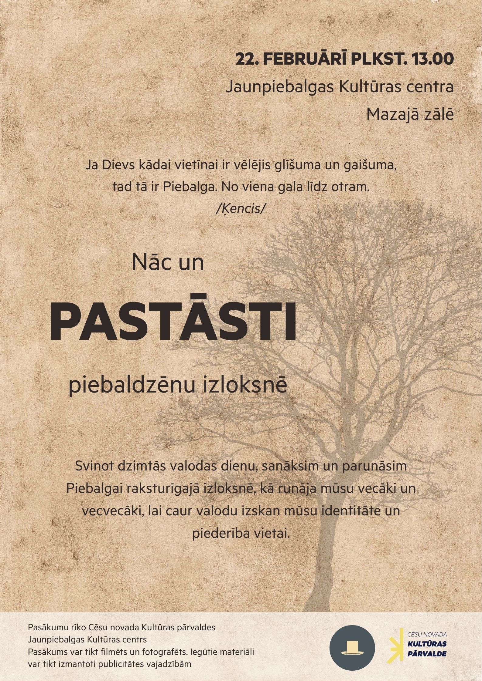 Svinot dzimtās valodas dienu, 22. februārī plkst. 13.00 Jaunpiebalgas Kultūras centrā sanāksim un runāsim Piebalgai raksturīgajā izloksnē, kā runāja mūsu vecāki un vecvecāki, lai caur valodu izskanētu mūsu identitāte un piederība vietai.
