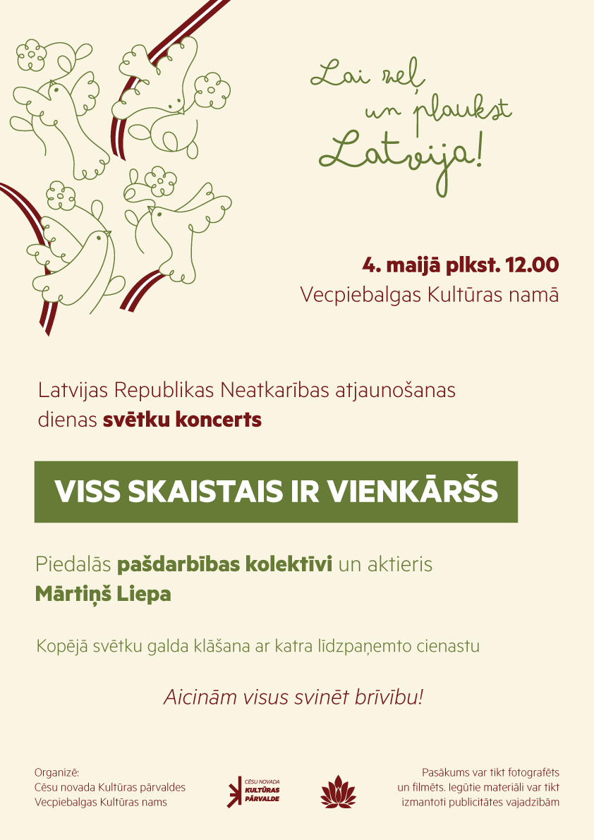 Pirmdien, 4. maijā, plkst. 12.00 Vecpiebalgas Kultūras namā izskanēs Latvijas Republikas Neatkarības atjaunošanas dienas svētku koncerts “Viss skaistais ir vienkāršs”.