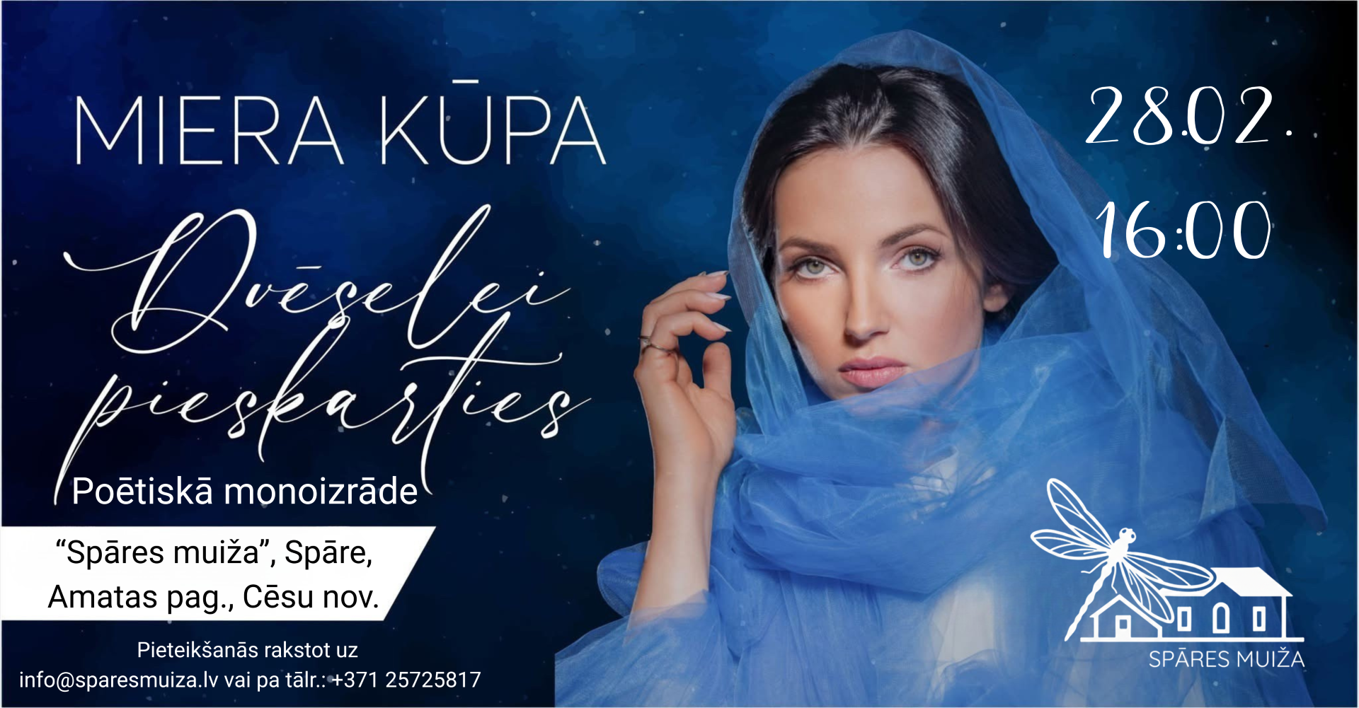 Sestdien, 28. februārī, plkst. 16.00 Spāres muižā viesosies dzejniece Miera Kūpa ar poētisku monoizrādi “Dvēselei pieskarties”.