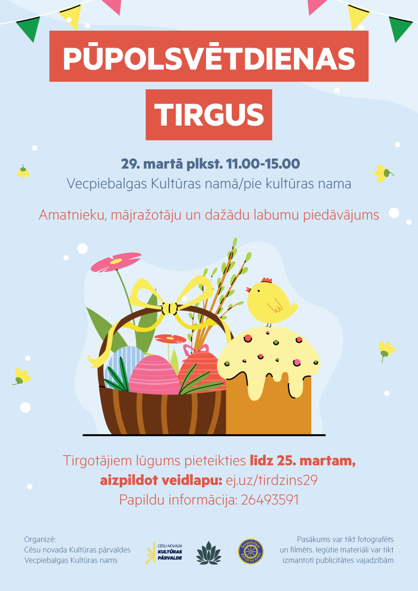 Svētdien, 29. martā, plkst. 11.00-15.00 Vecpiebalgas Kultūras namā/pie kultūras nama norisināsies Pūpolsvētdienas tirgus.