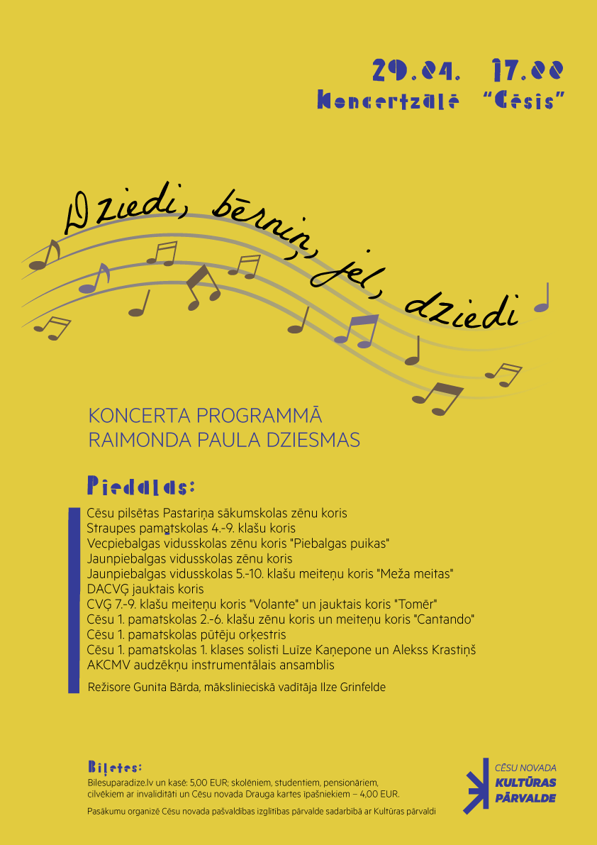Aprīļa beigās, 29. aprīlī, plkst. 17.00 koncertzālē “Cēsis” Cēsu novada skolu kori tiksies uz Raimnoda Paula jubilejai veltītu koncertu “Dziedi, bērniņ, jel, dziedi”.