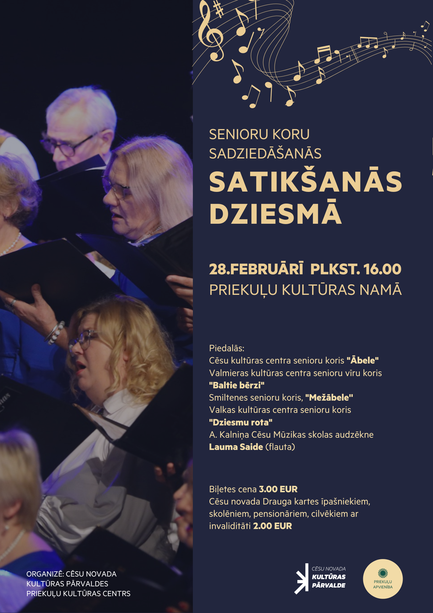 Sestdien, 28. februārī, plkst. 16.00 Priekuļu Kultūras namā notiks senioru koru sadziedāšanās “Satikšanās dziesmā”.