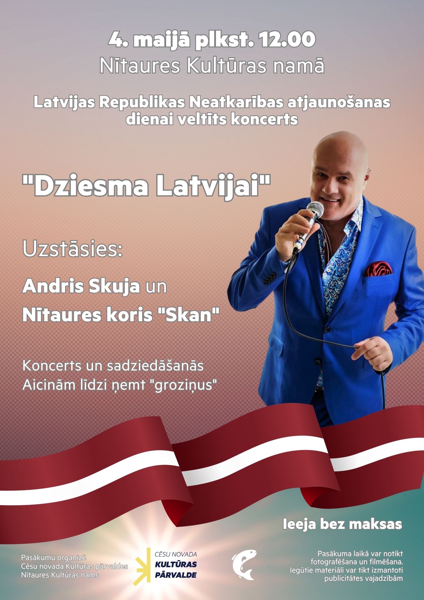 Latvijas Republikas Neatkarības atjaunošanas dienā, 4. maijā, plkst. 12.00 Nītaures Kultūras namā izskanēs svētku koncerts “Dziesma Latvijai”.