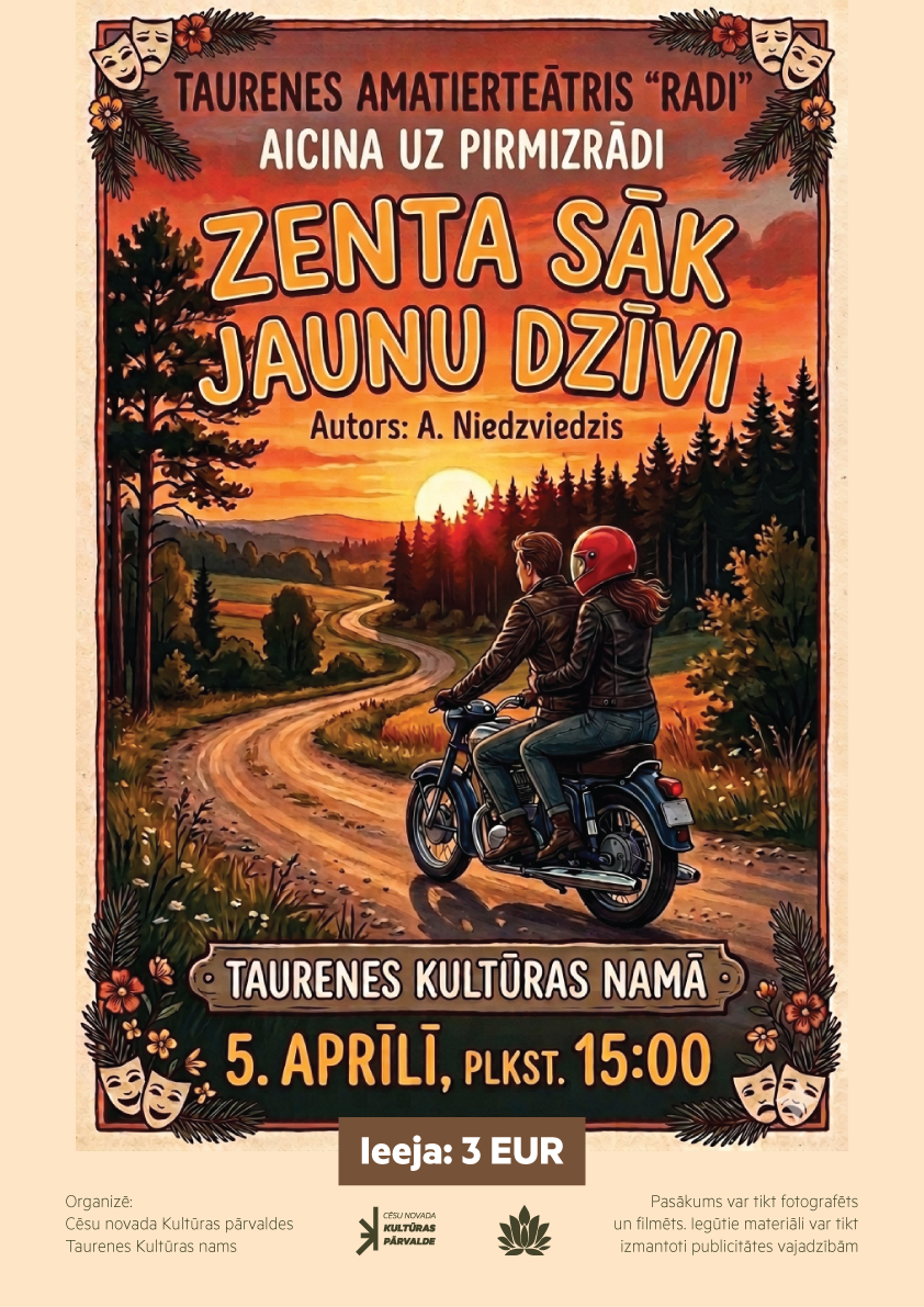 Svētdien, 5. aprīlī, plkst. 15.00 Taurenes Kultūras namā Taurenes amatierteātris “Radi” aicina uz pirmizrādi “Zenta sāk jaunu dzīvi” (autors: A. Niedzviedzis).