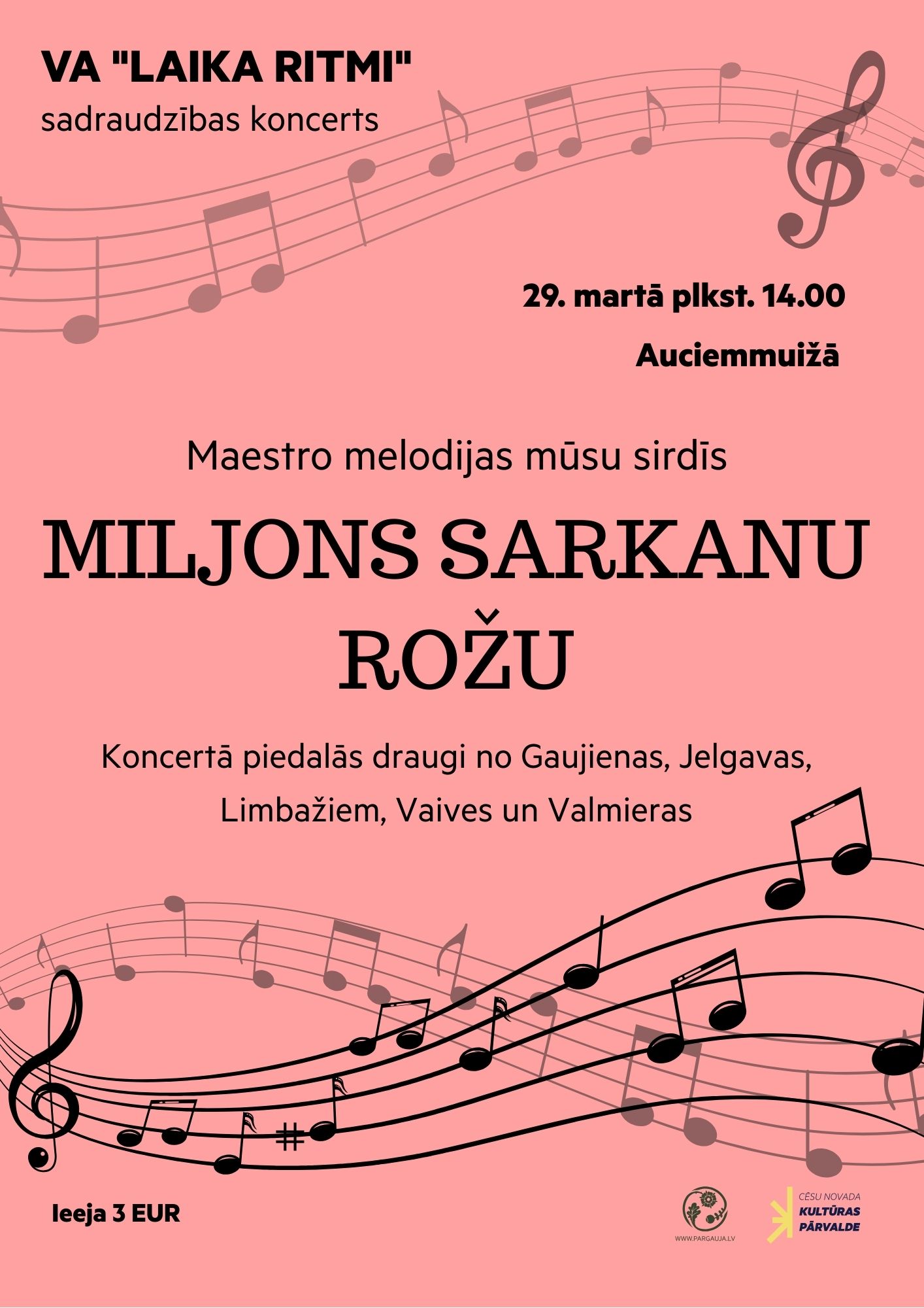 Svētdien, 29. martā, plkst. 14.00 Raiskuma pagasta Tautas namā “Auciemmuiža” aicinām uz sirsnīgu un melodijām bagātu vokālā ansambļa “Laika ritmi” koncertu “Maestro melodijas mūsu sirdīs – miljons sarkanu rožu”.