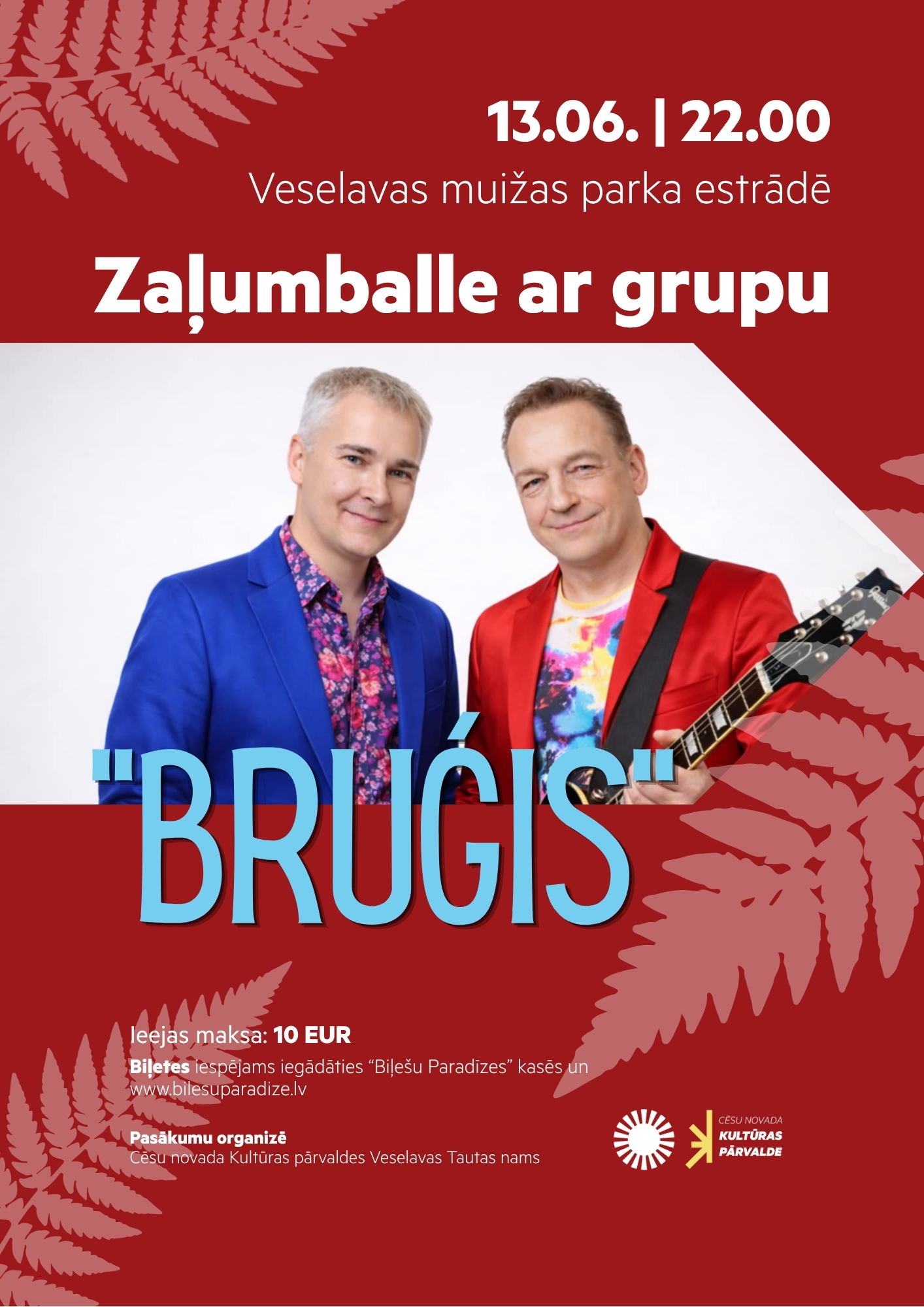 Sestdien, 13. jūnijā, plkst. 22.00 Veselavas muižas parka estrādē aicinām uz zaļumballi ar grupu “Bruģis”!